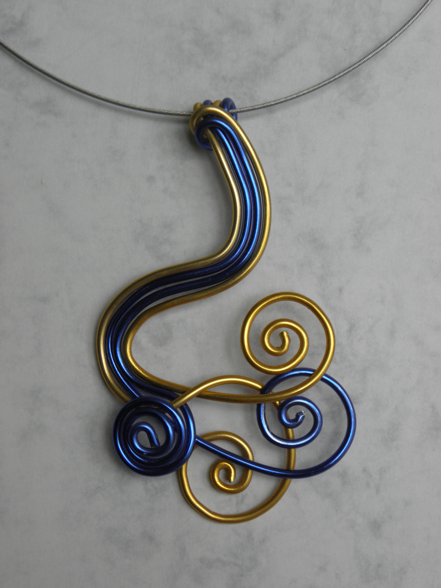 Dvojfarebný prívesok pripomínajúci PÁVA pozostáva z dvoch drôtikov - modrej a zlatej farby. Drôtiky sú v spodnej časti stočené.