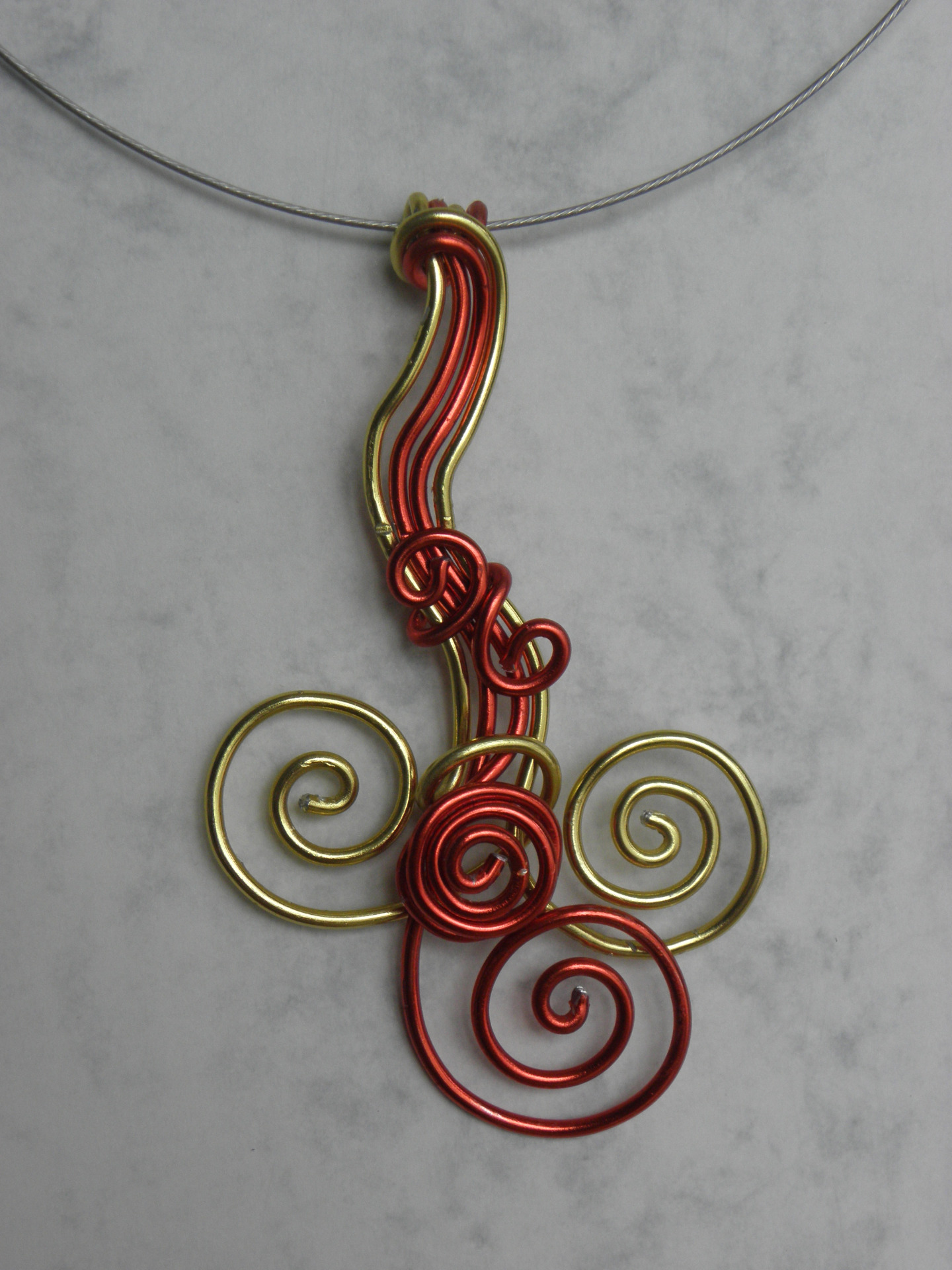 Dvojfarebný prívesok pripomínajúci PÁVA pozostáva z dvoch drôtikov - červenej a zlatej farby. Drôtiky sú v spodnej časti stočené.