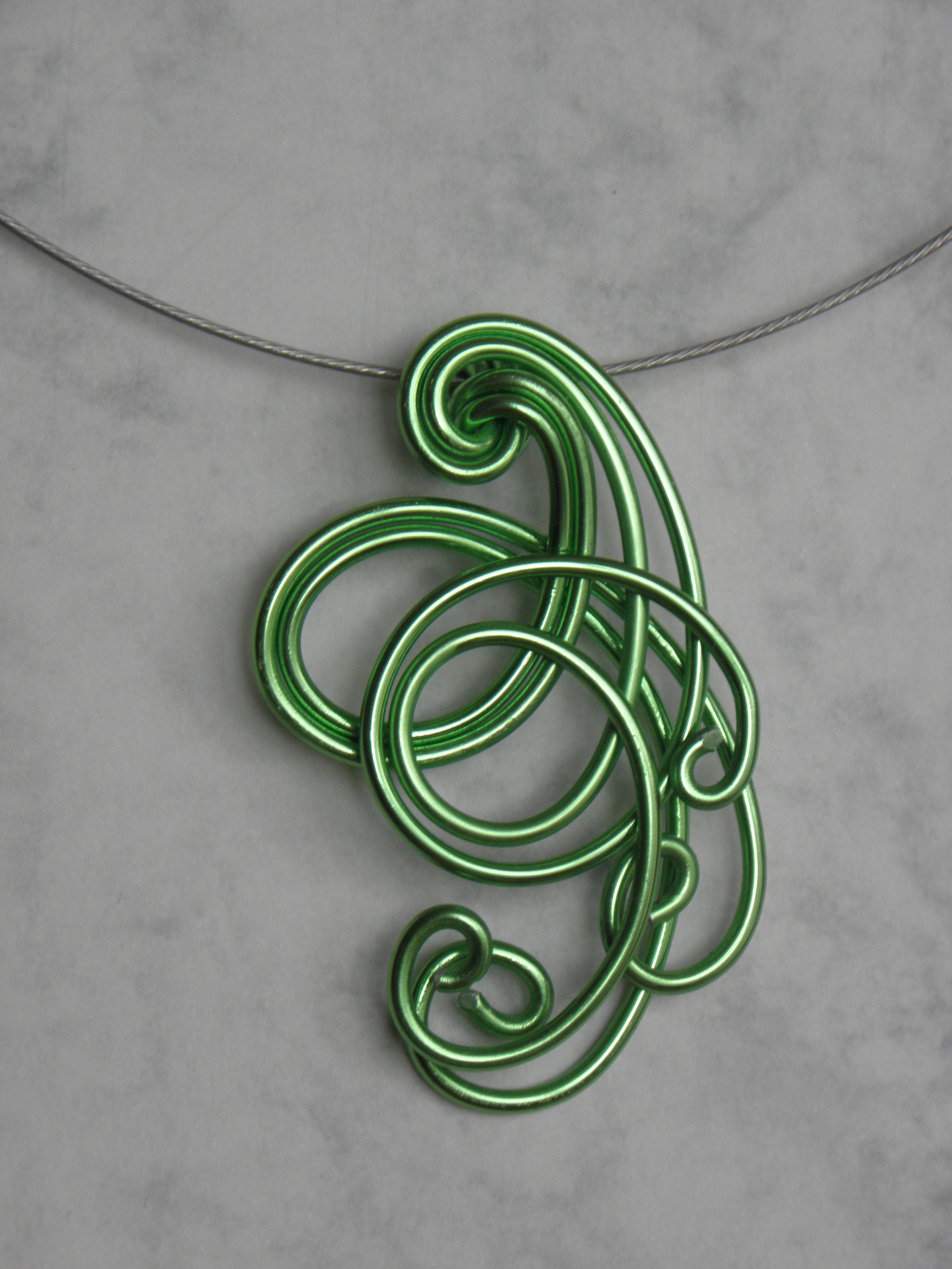 Lesklý prívesok je zdobený z dvoch drôtikov svetlo zelenej farby.