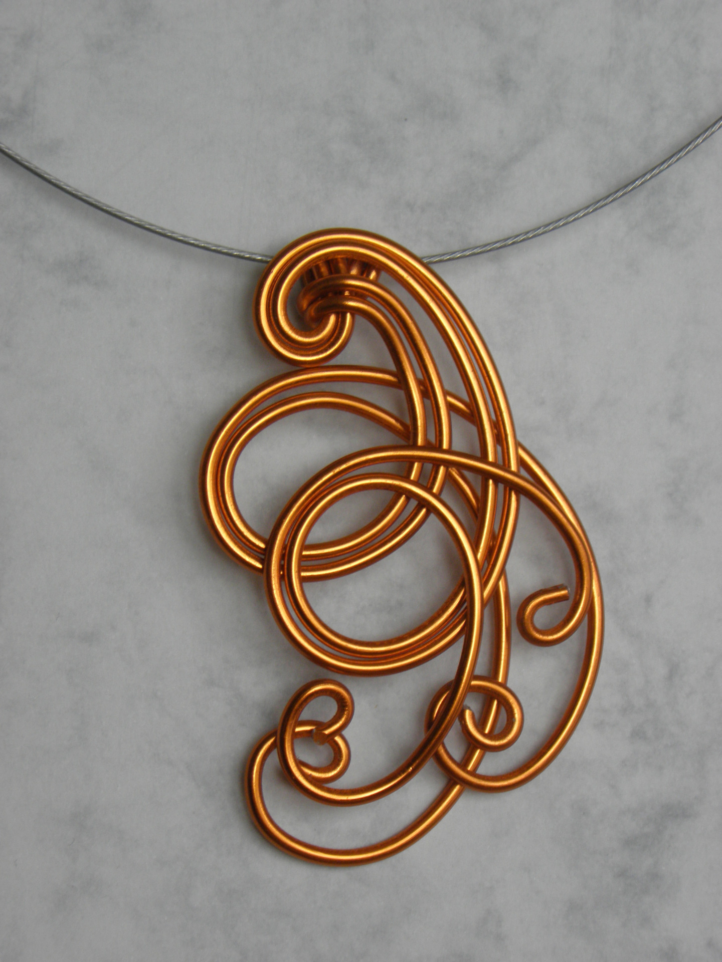 Lesklý prívesok je zdobený z dvoch drôtikov oranžovej farby.
