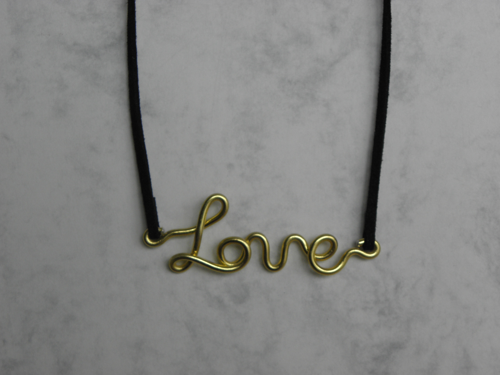 Jednofarebný prívesok zlatej farby má podobu nápisu "Love". Prívesok visí na koženej šnúrke, ktorá má americké zapínanie.