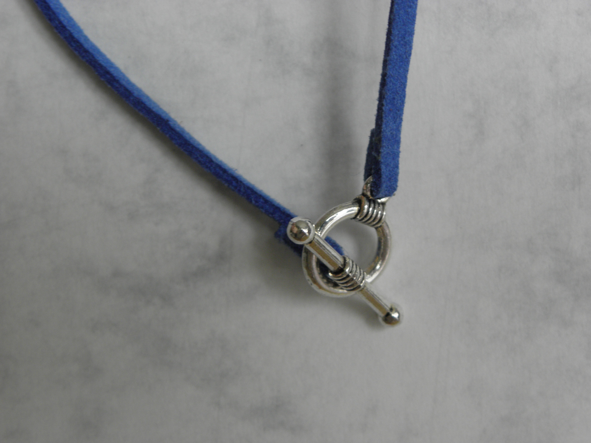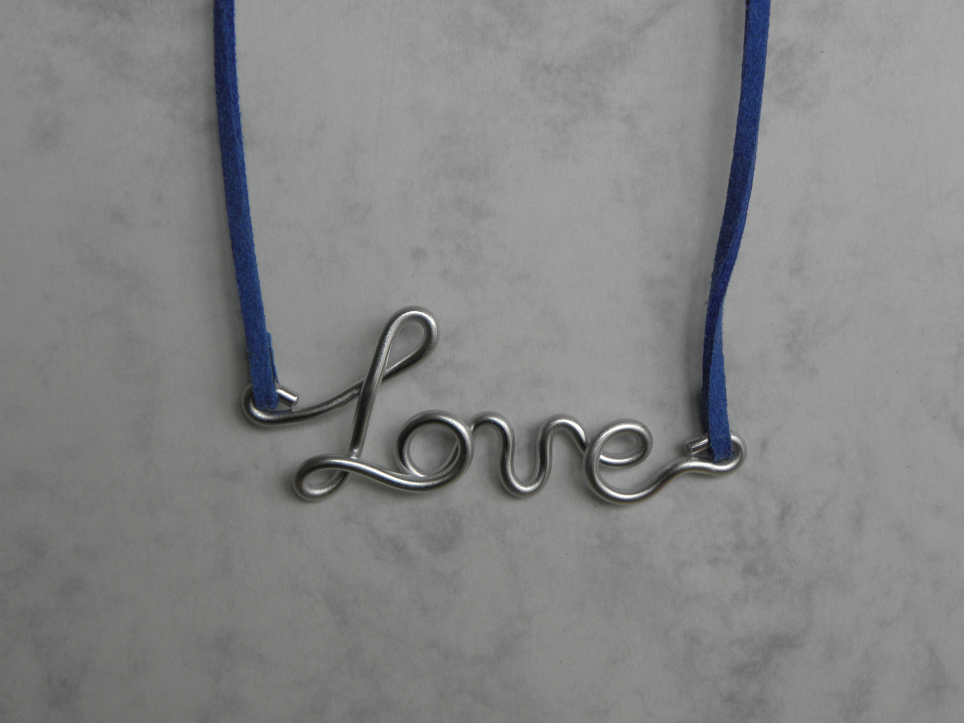 Jednofarebný prívesok striebornej farby má podobu nápisu "Love". Prívesok visí na koženej šnúrke modrej farby, ktorá má americké zapínanie.
