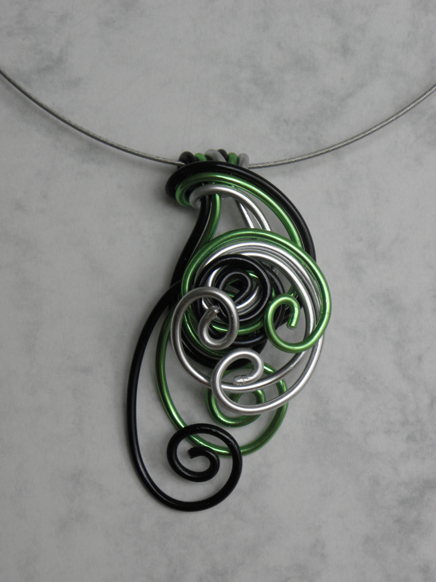 Trojfarebný prívesok pozostáva z troch drôtikov - čiernej, striebornej a zelenej farby. Drôtiky sú nahusto stáčané.